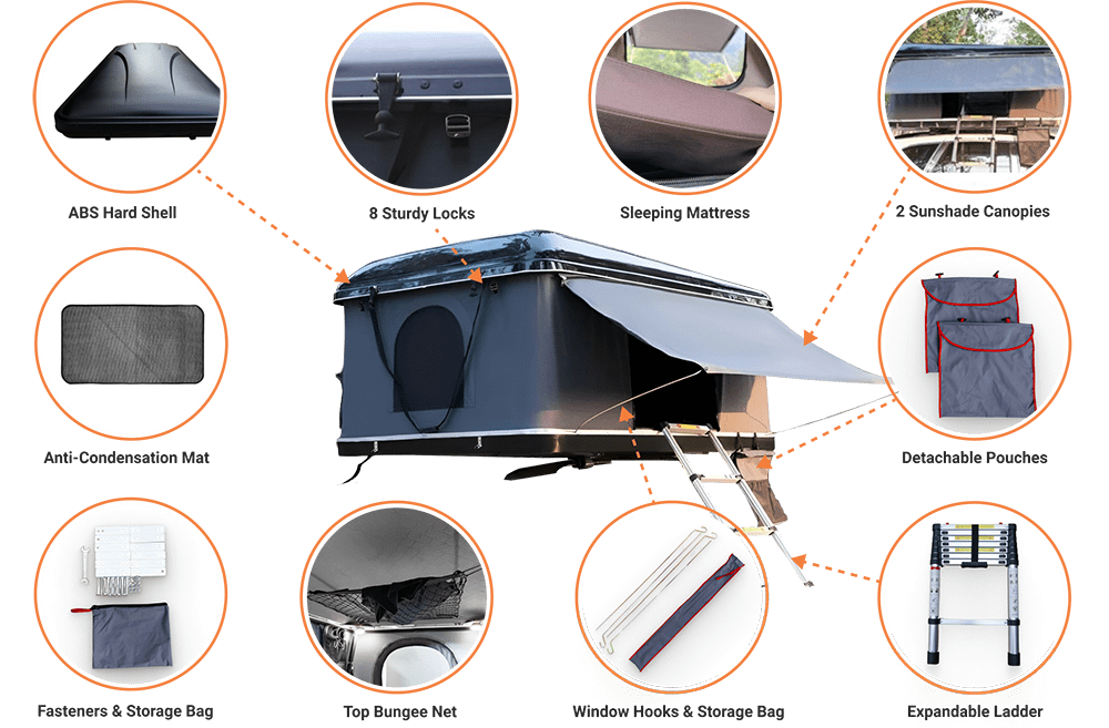 In addition to its comfort features, our car roof top tent also has options for convenient storage of your camping essentials. Packed with detachable storing pouches and bungee net on top, it provides handy travel organization and easily accessible storage spots.